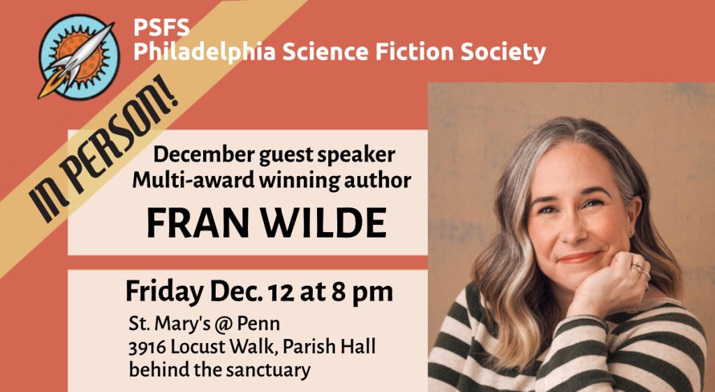 Our December meeting will be on Friday, December 12 at 8 pm. Our guest speaker is the multi-award winning author Fran Wilde! This is an in-person meeting, held at St. Mary’s at Penn, 3916 Locust Walk, in the Parish building behind the Sanctuary. Questions: email us at info@psfs.org.